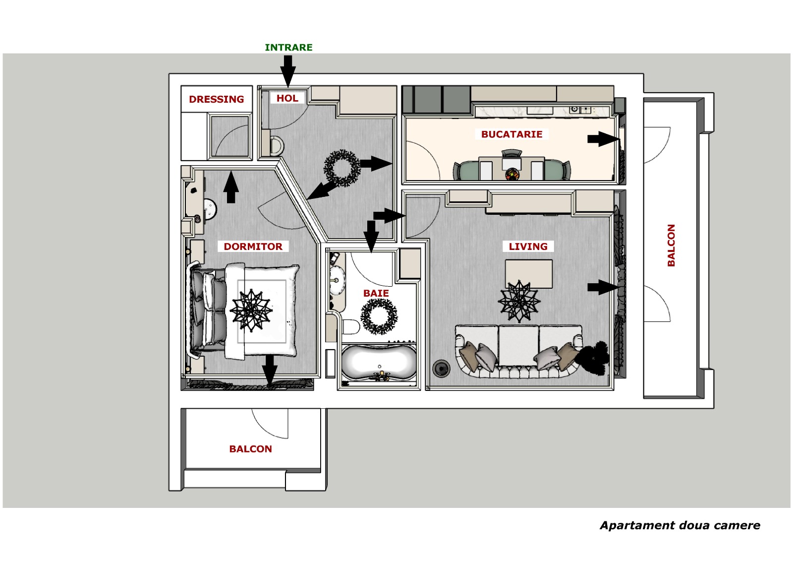 Flux logic zi/noapte, spații de depozitare și balcoane utile.