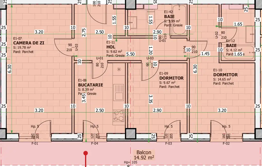 Acest tip de apartament oferă o structură echilibrată, cu o zonă de zi spațioasă și luminată, un living generos și o bucătărie bine definită. Ferestrele mari, realizate cu tâmplărie PVC și geam tripan, asigură lumină naturală pe tot parcursul zilei și contribuie la o izolare bună. Camera de zi este suficientă pentru relaxare, dining și activități de familie, iar accesul către balconul mare extinde vizual spațiul interior.
