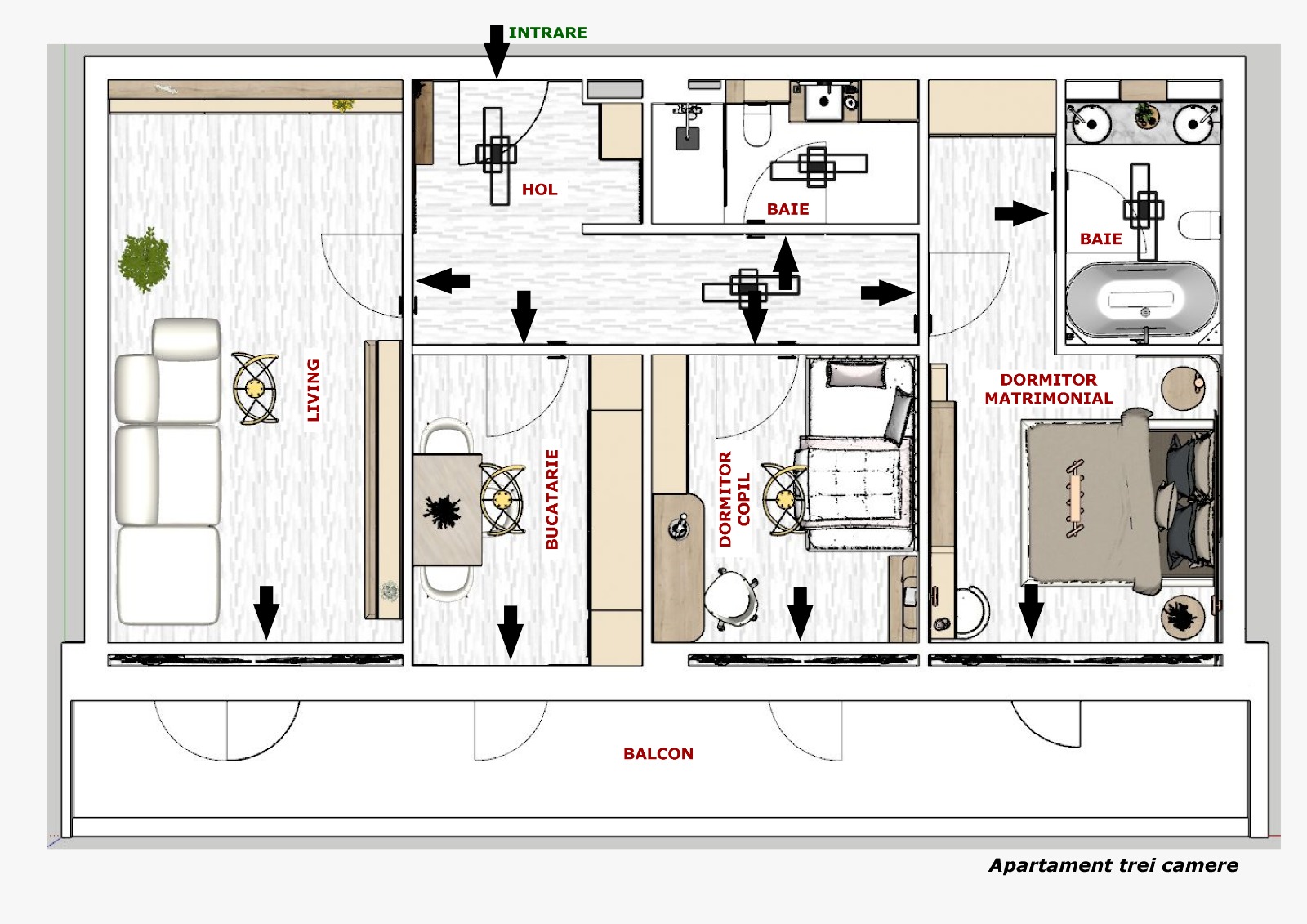 Flux logic zi/noapte, spații de depozitare și balcoane utile.